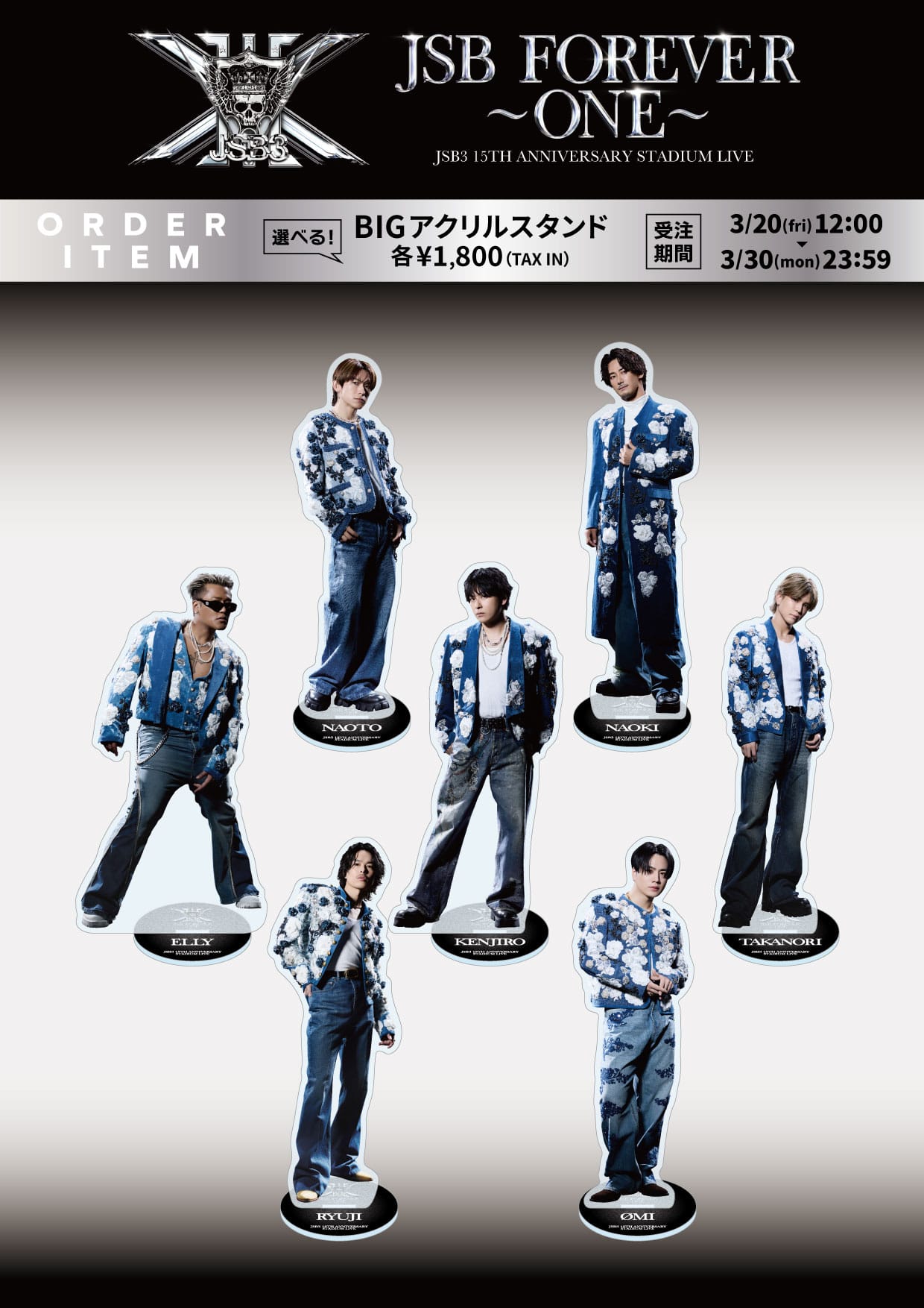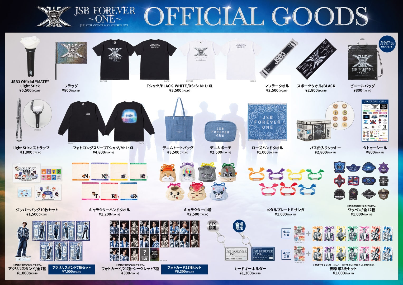 4/11(土)、4/12(日)に開催される「三代⽬ J SOUL BROTHERS 15TH ANNIVERSARY STADIUM LIVE "JSB FOREVER ~ONE~"」味の素スタジアム公演オフィシャルグッズが発売!!