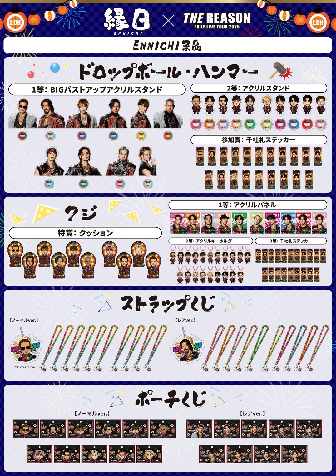 ★ドロップボール 1回500円 ※1 ★ハンマー 1回500円 ※1 ★クジ 1回500円 ※2 ★ストラップくじ 1回500円 ※3 ★ポーチくじ 1回1000円 ※3 ※景品は無くなり次第終了となります。 ※いずれのコンテンツもEXILE/STARTING MEMBERの選択が可能となります。 ※1:2等、参加賞はランダム、1等は選択が可能となります。 ※2:特賞は抽選、2等、3等はランダム、1等は選択が可能となります。 ※3:ランダムとなります。 |