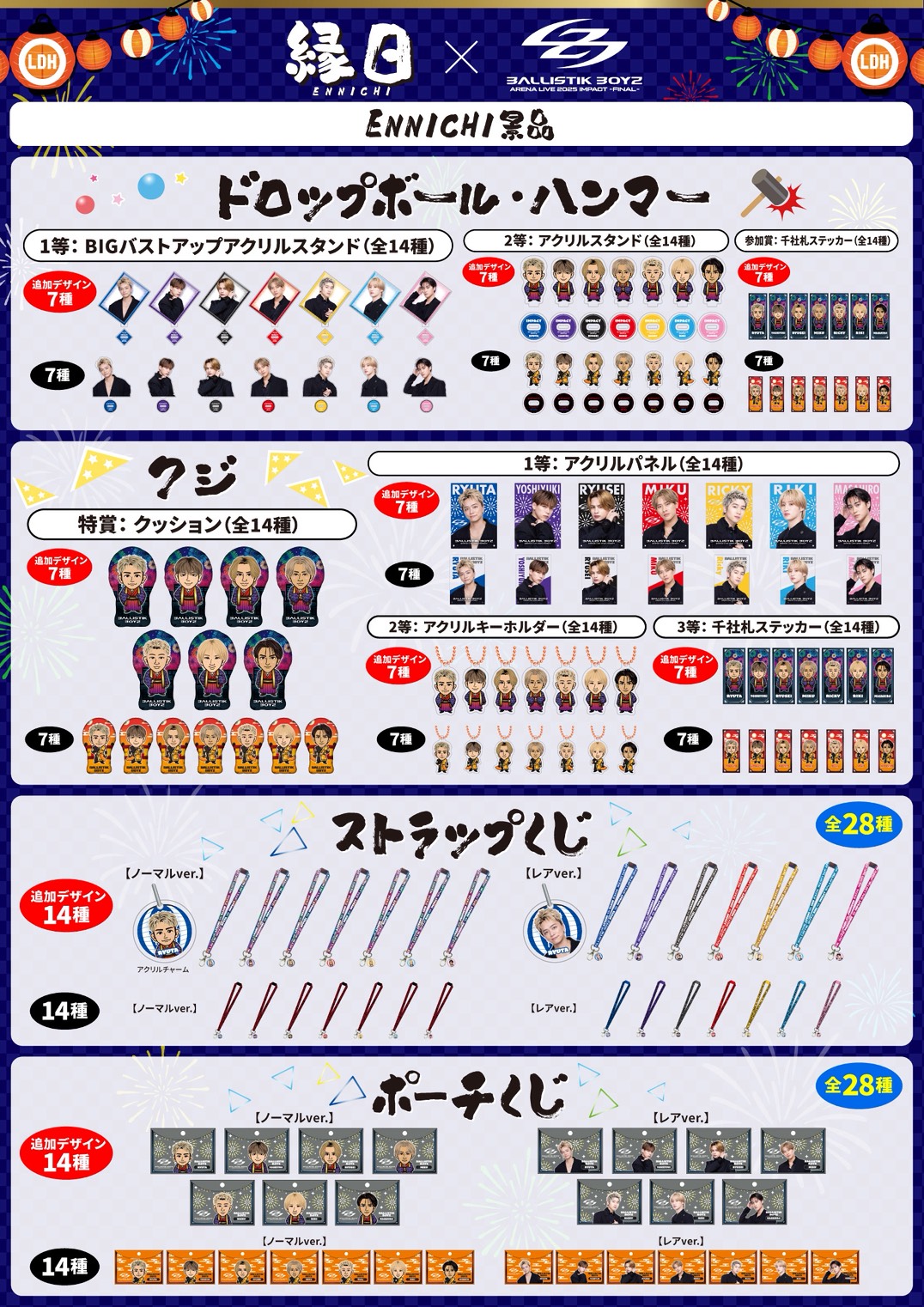 ★ドロップボール 1回500円 ※1 ★ハンマー 1回500円 ※1 ★クジ 1回500円 ※2 ★ストラップくじ 1回500円 ※3 ★ポーチくじ 1回1000円 ※3 ※景品は無くなり次第終了となります。 ※1:2等、参加賞はランダム、1等は選択が可能となります。 ※2:特賞は抽選、2等、3等はランダム、1等は選択が可能となります。 ※3:ランダムとなります。 |