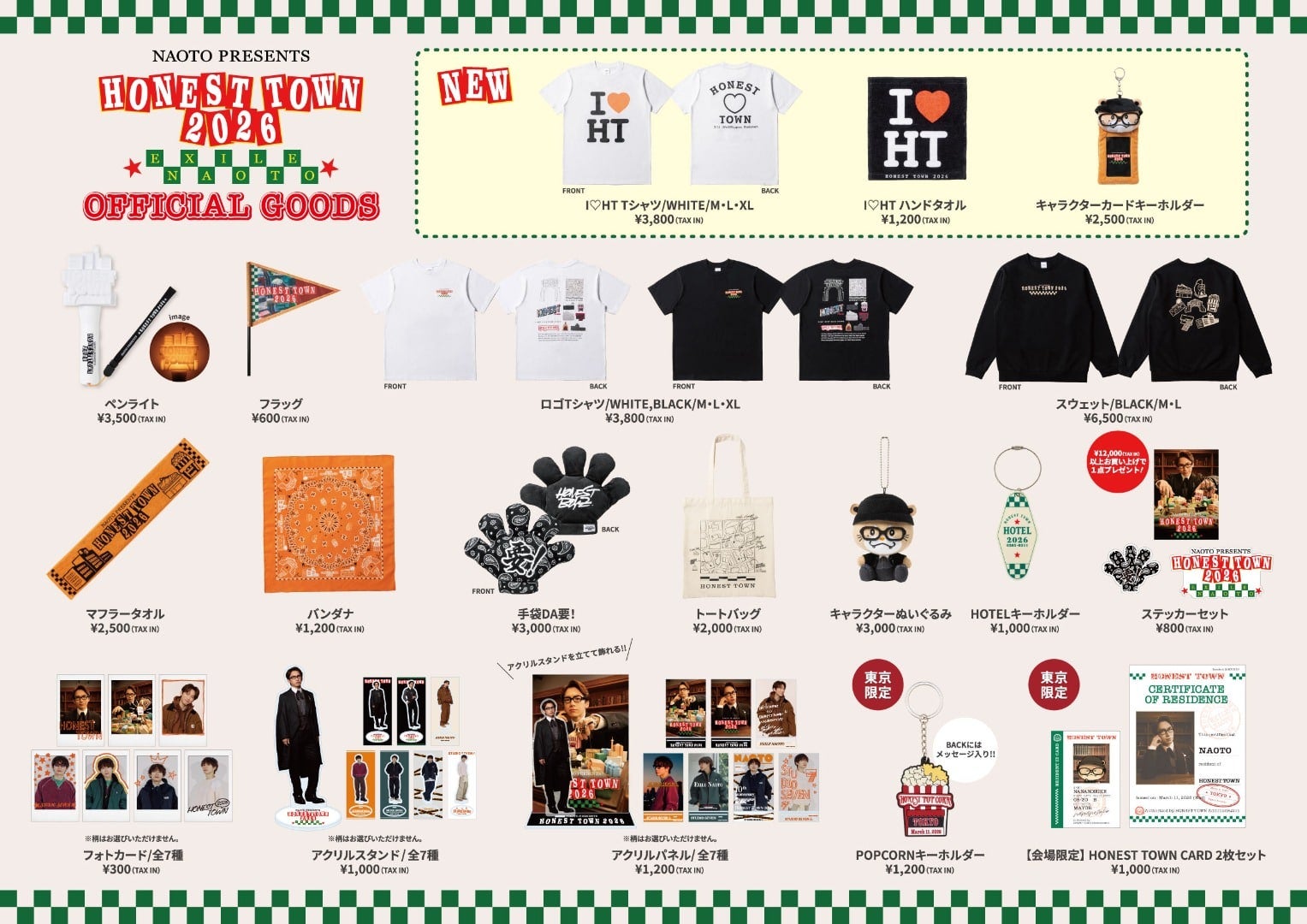 ※会場物販列の状況、及び天候等やむをえない状況により、予定しております販売時間が前後する可能性、販売を中断する可能性がございますので予めご了承ください。販売商品 HONEST TOWN 全商品 購入制限 ・HONEST TOWN I♡HT ハンドタオル:お一人様2点まで
