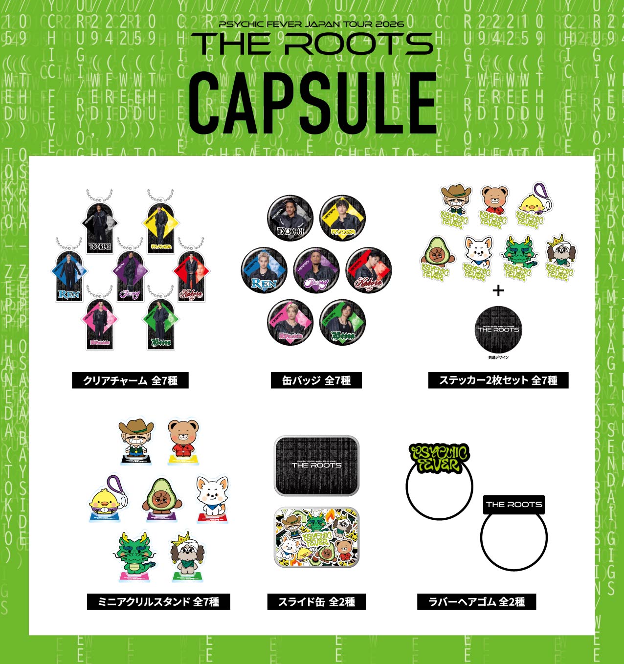 ※会場物販列の状況、及び天候等やむをえない状況により、予定しております販売時間が前後する可能性、販売を中断する可能性がございますので予めご了承ください。販売商品 ”THE ROOTS”カプセル