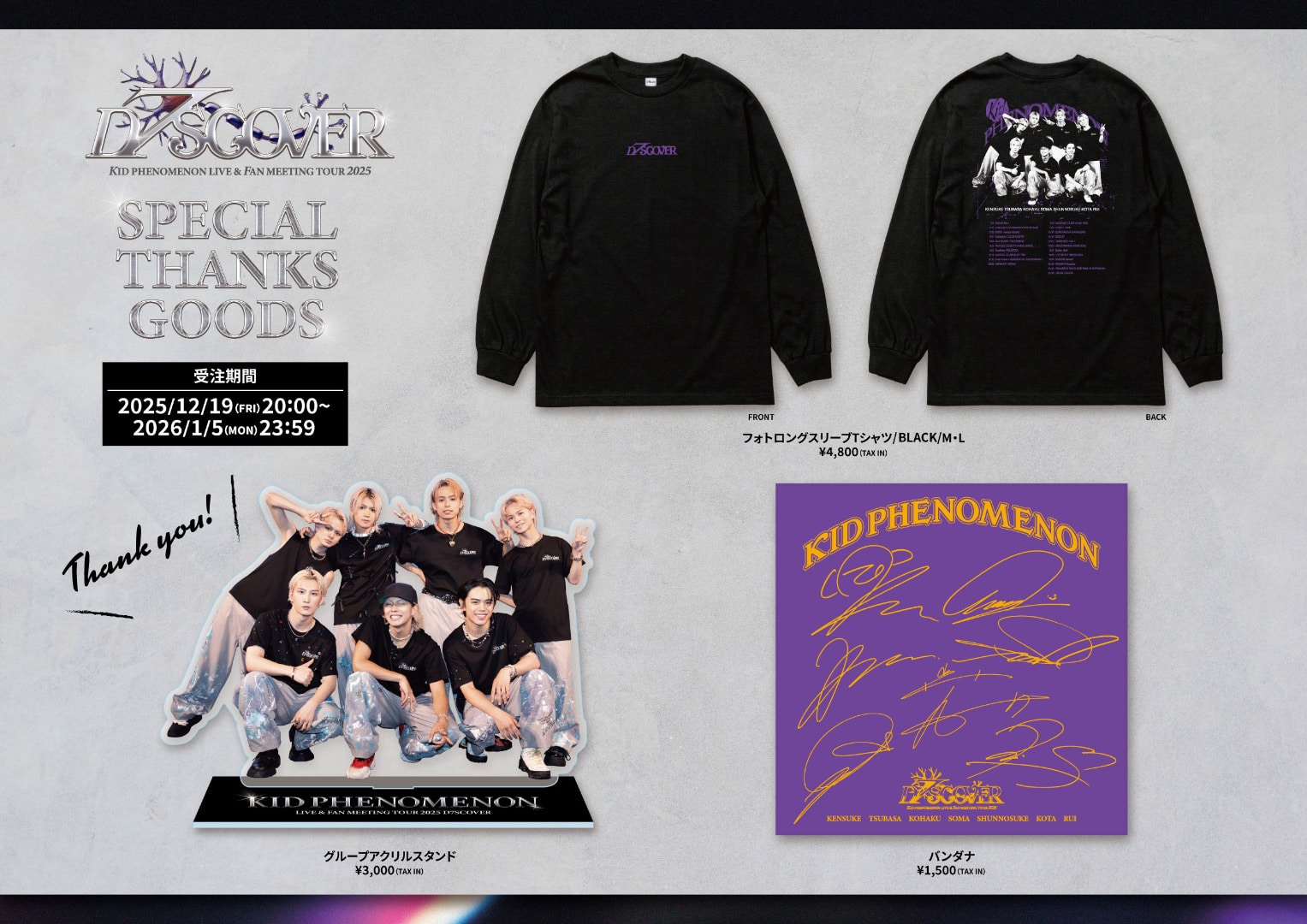 KID PHENOMENON LIVE & FAN MEETING TOUR 2025 ~D7SCOVER~の完走を記念して、皆さんへの感謝の気持ちを込めたSpecial Thanks Goodsの受注販売が決定しました!!